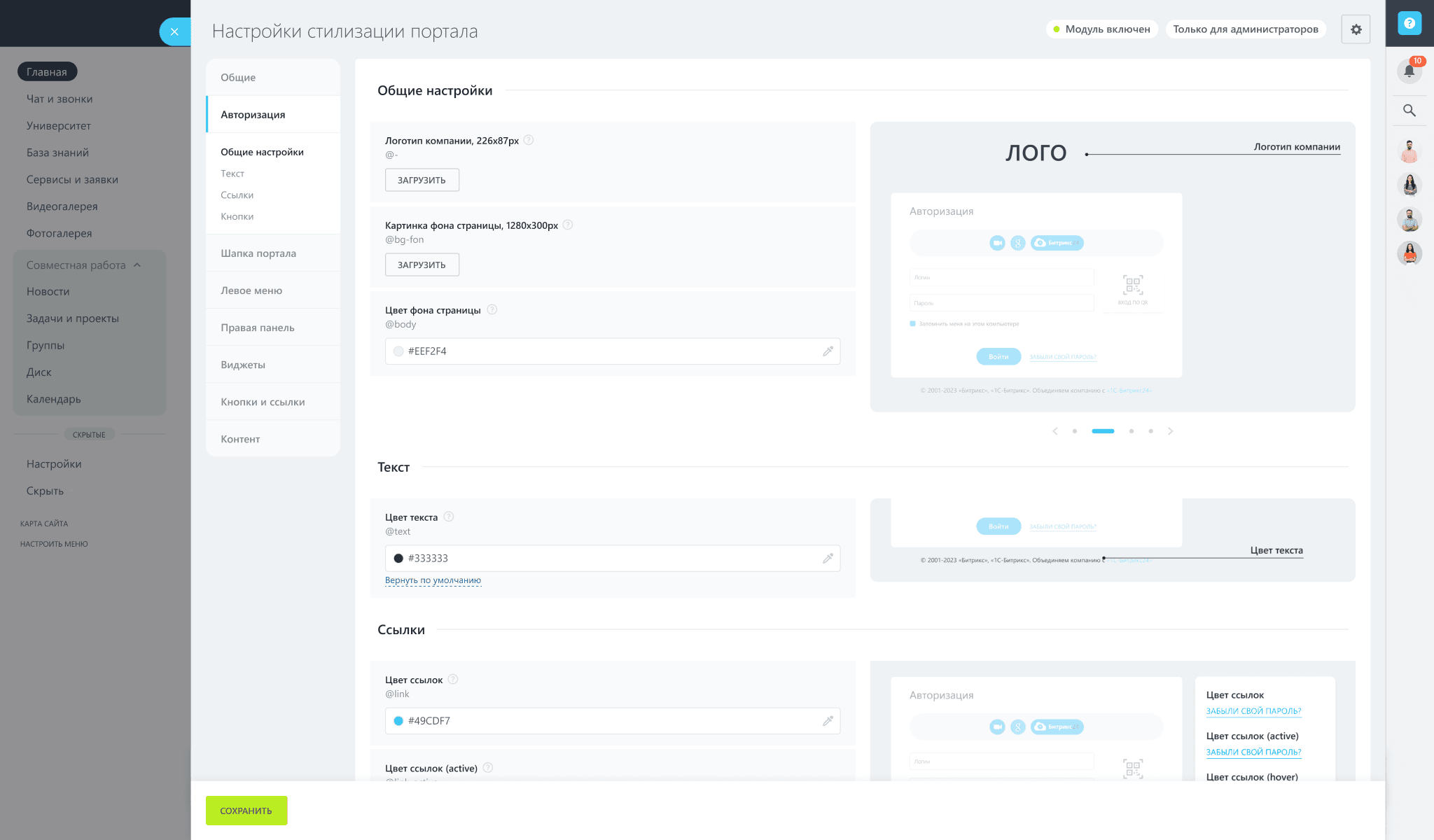 Модуль «Брендирование» — один из самых популярных продуктов компании. Обычно он идет в связке с флагманским модулем «Главная страница» и позволяет стилизовать портал Битрикс24 под фирменный стиль компании.