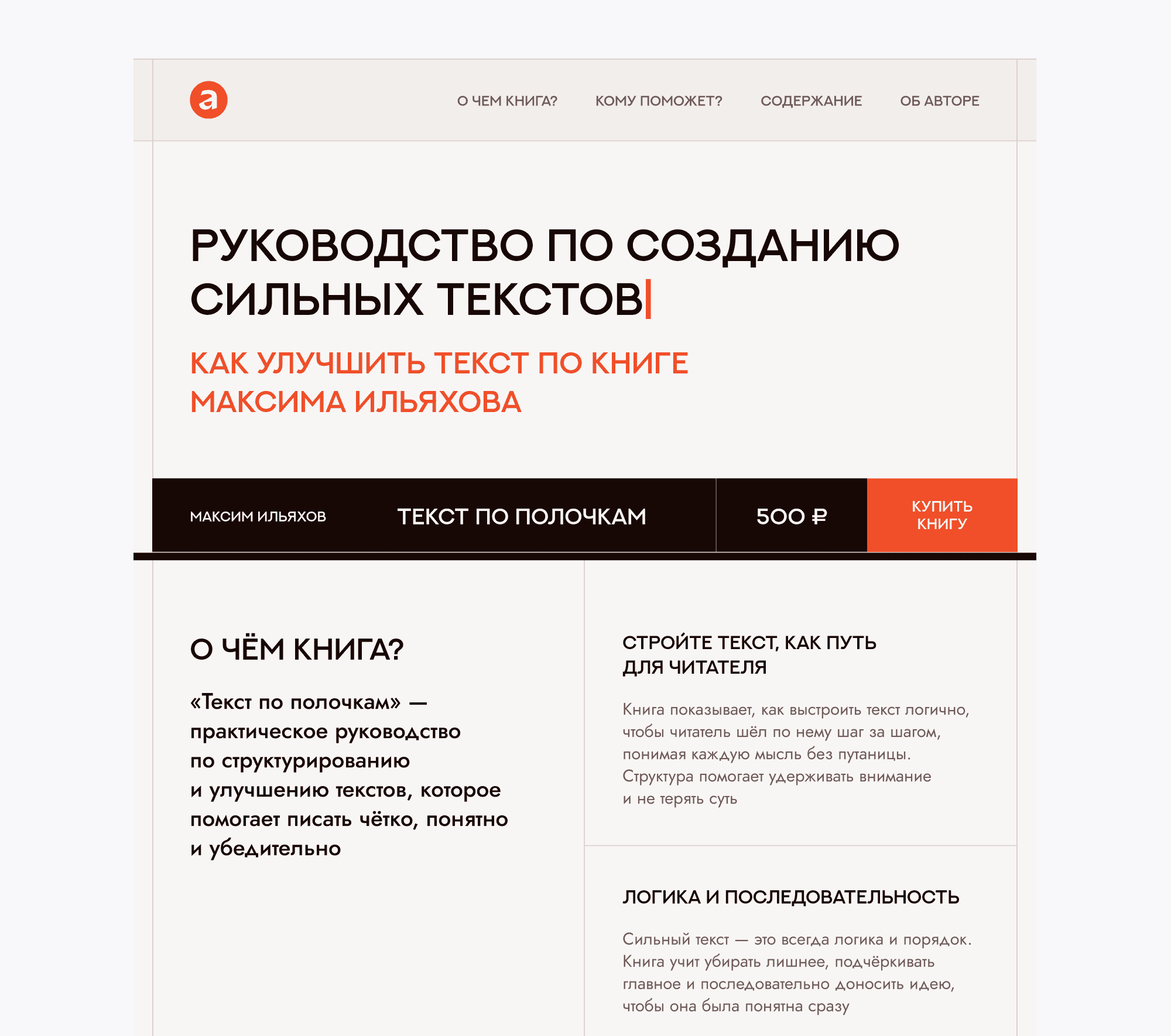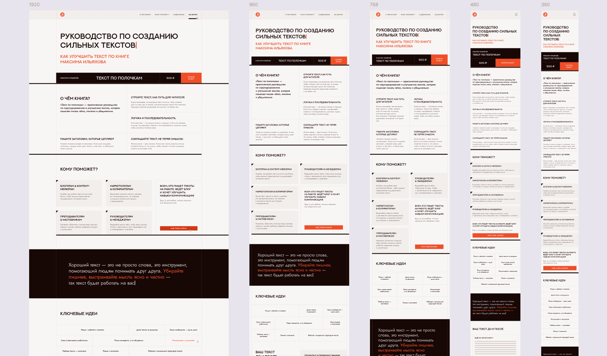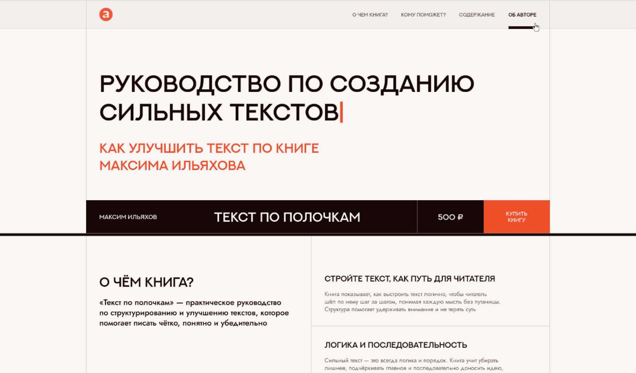 Учебный проект по дизайну лендинга для продвижения книги Максима Ильяхова «Текст по полочкам». Основная цель: представить ценность книги, её структуру и примеры, создать удобный и адаптивный пользовательский опыт.