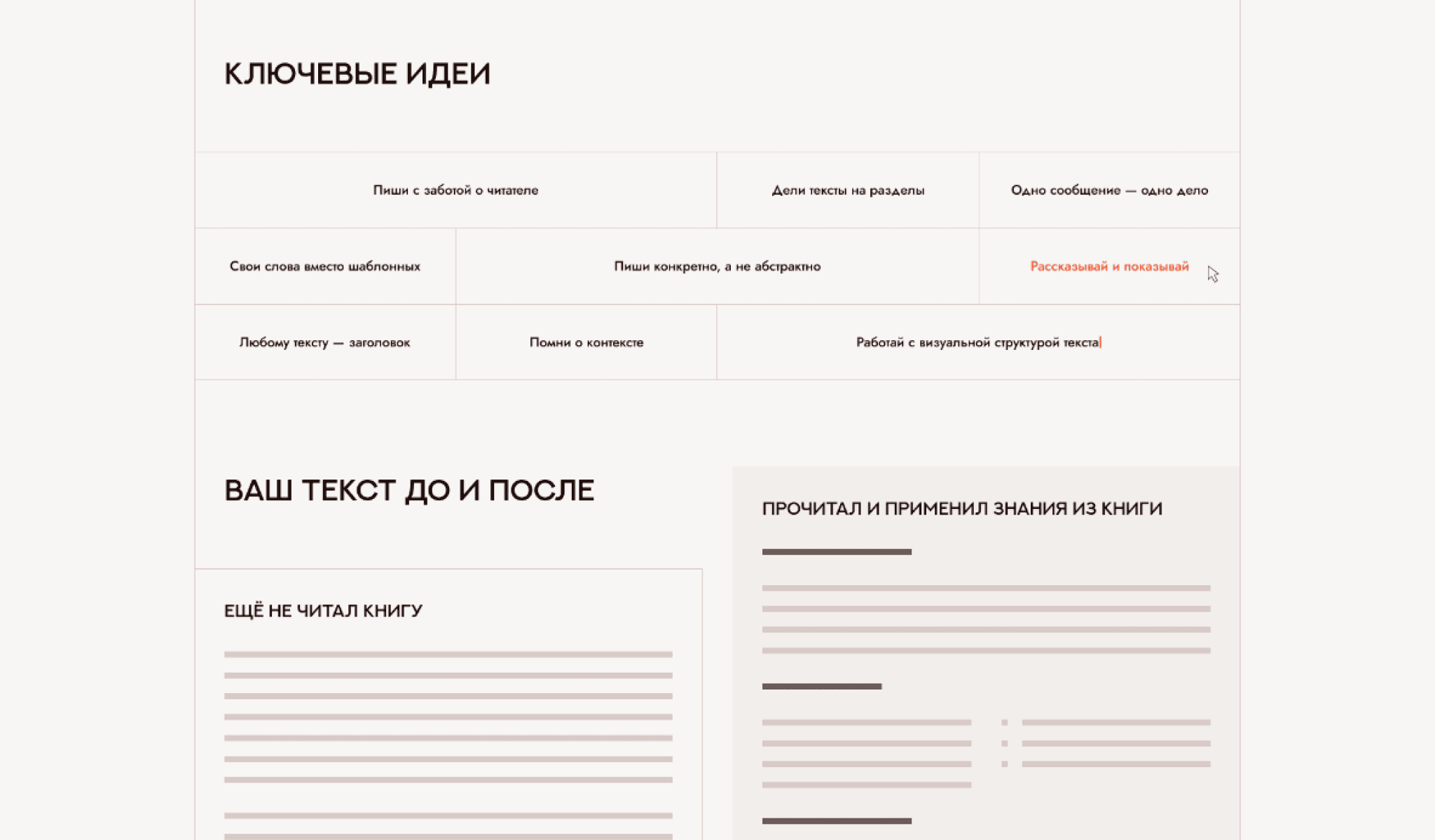 Прототипирование. Проработала структуру страницы, разделила контент на логические блоки. Продумала расположение ключевых акцентов: ценностные предложения, примеры текста и идеи автора.